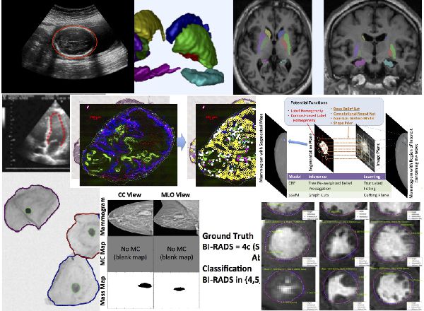 Use of machine learning and, more specifically, deep learning methods for the problems of detection, segmentation and classification of anatomical structures in several medical image modalities, such as mammograms, MRI, CTs, ultrasound, and microscopy.