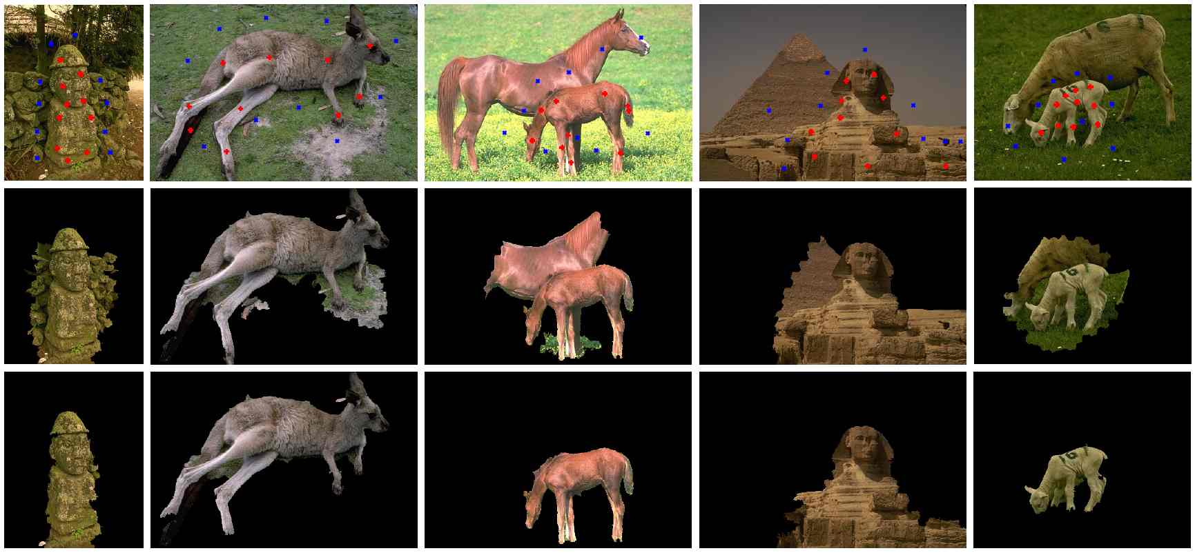 Segmentation results on the Berkeley dataset. The top row shows the original images with partial labelled pixels. Our SDCut (bottom) achieves better results than BNCut (middle).